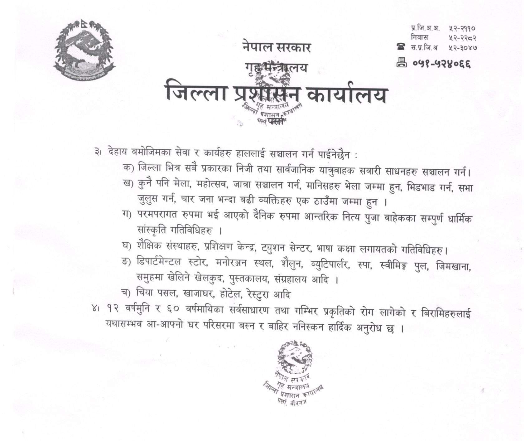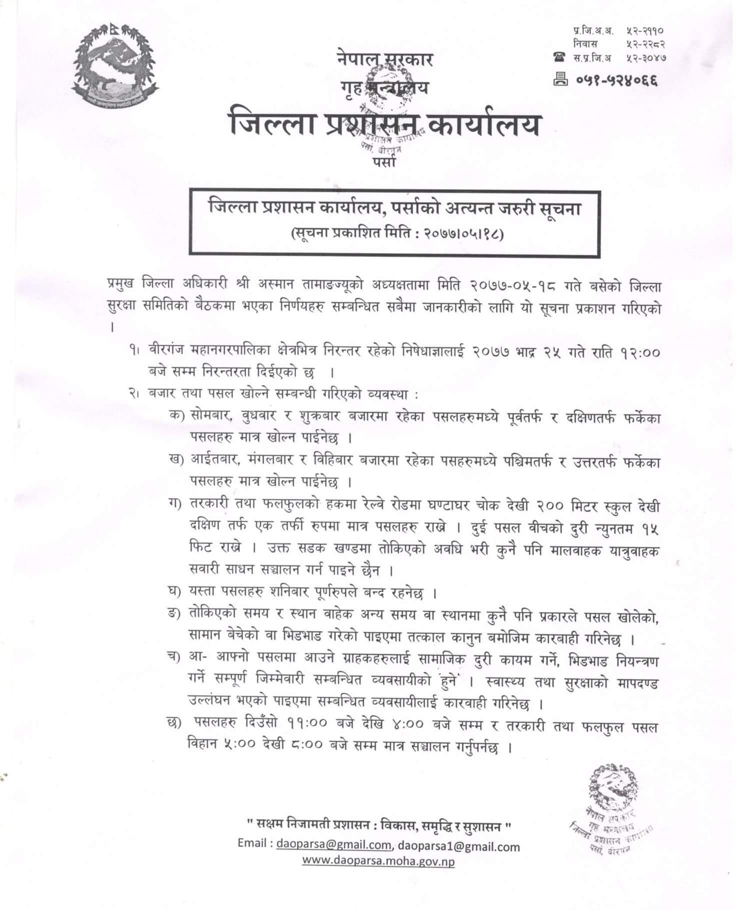 भदौ १९ गते वीरगंज महानगरमा निषेधाज्ञाको मिति समाप्त हुन गइरहेकोमा आज जिल्ला संकट व्यवस्थापन केन्द्रको बैठकले भदौ २५ गते राति १२ बजेसम्मका लागि निषेधाज्ञा लम्ब्याएको छ । सूचनामा मेनरोडको पूर्व र दक्षिणतर्फका पसल सोमवार, बुधवार, शुक्रवार र पश्चिमतर्फका पसलहरु आइतवार, मंगलवार र बिहीवार बिहान ११ बजेदेखि ४ बजेसम्म खाद्यान्न पसलहरु सञ्चालन गर्न पाउने उल्लेख छ ।