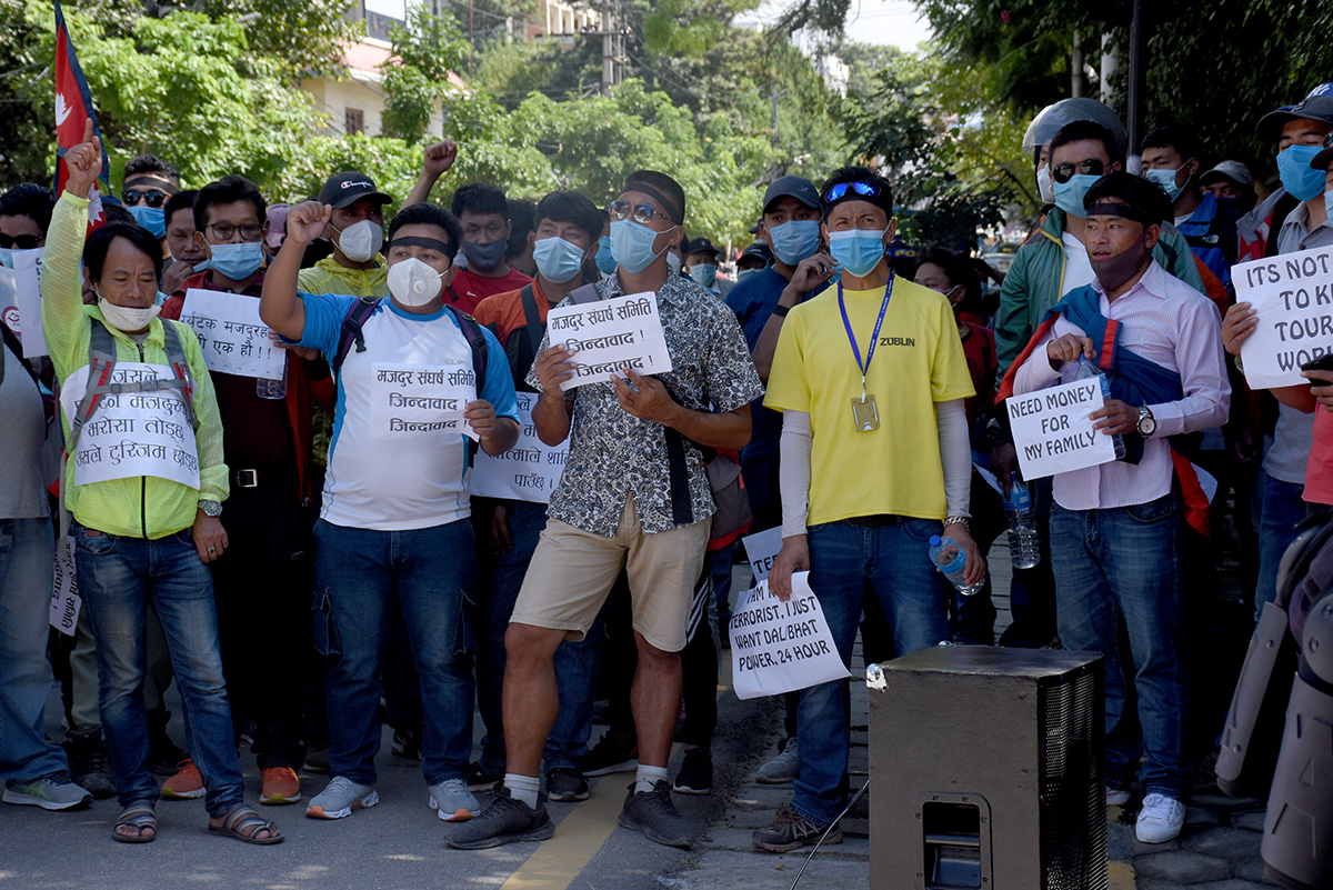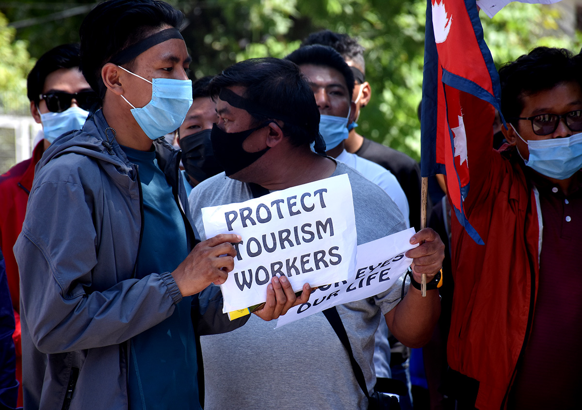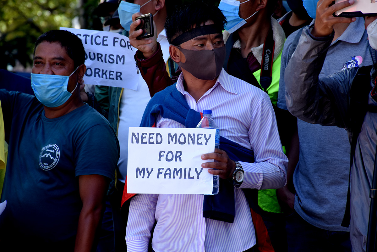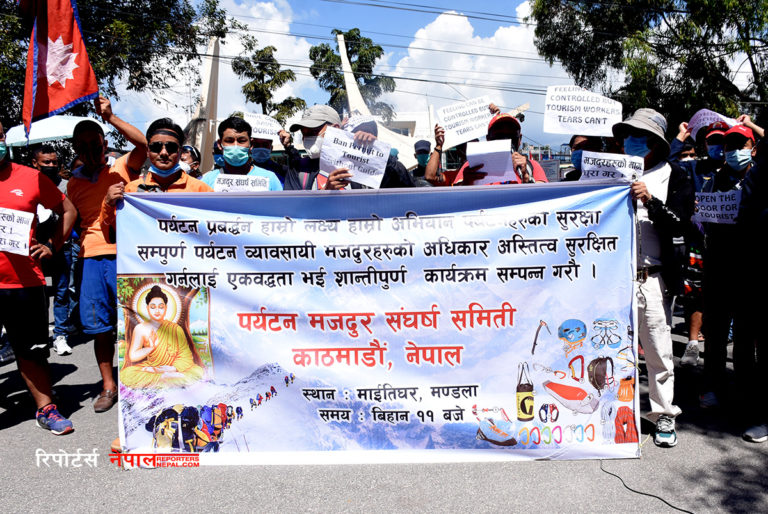 उनीहरुले बोकेका ब्यानरमा ‘निड मनी फर माई फ्याम्ली’, प्रोटेक्ट टुरिजम वर्कर्स, जसले पर्यटन मजदुरको भरोसा तोड्छ, उसले टुरिजम छोड्छ’ जस्ता नारा लेखिएका थिए ।तस्विर ः मुकुन्द कालिकोटे, रिपोर्टर्स नेपाल डटकम