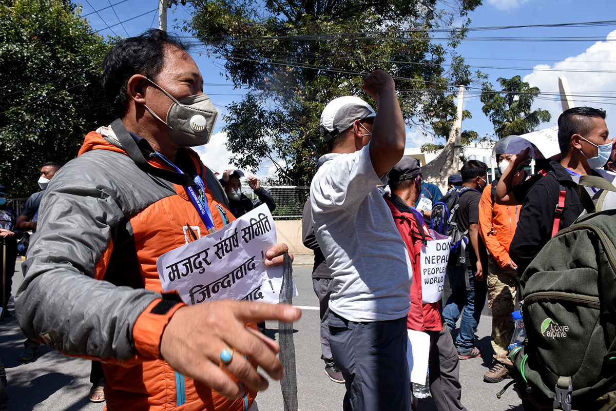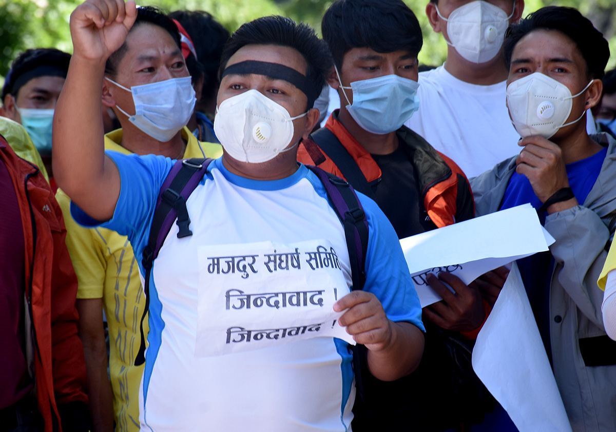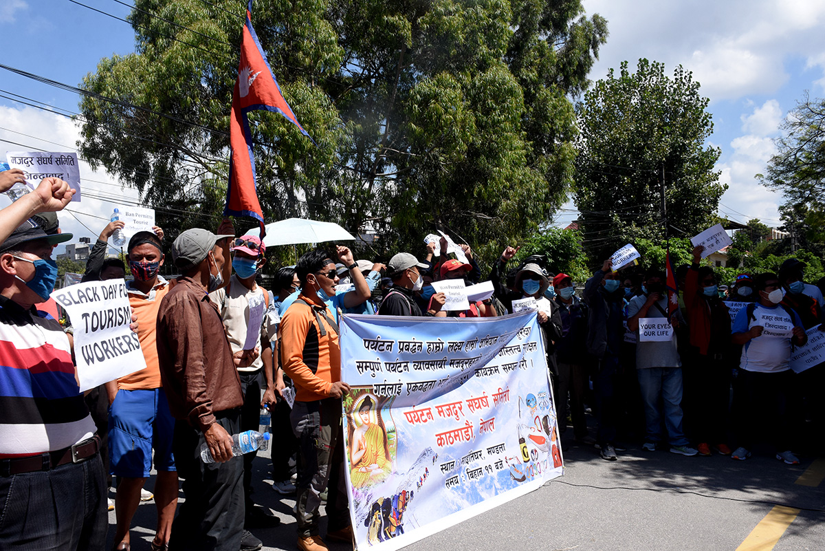 उनीहरुले बोकेका ब्यानरमा ‘निड मनी फर माई फ्याम्ली’, प्रोटेक्ट टुरिजम वर्कर्स, जसले पर्यटन मजदुरको भरोसा तोड्छ, उसले टुरिजम छोड्छ’ जस्ता नारा लेखिएका थिए ।तस्विर ः मुकुन्द कालिकोटे, रिपोर्टर्स नेपाल डटकम