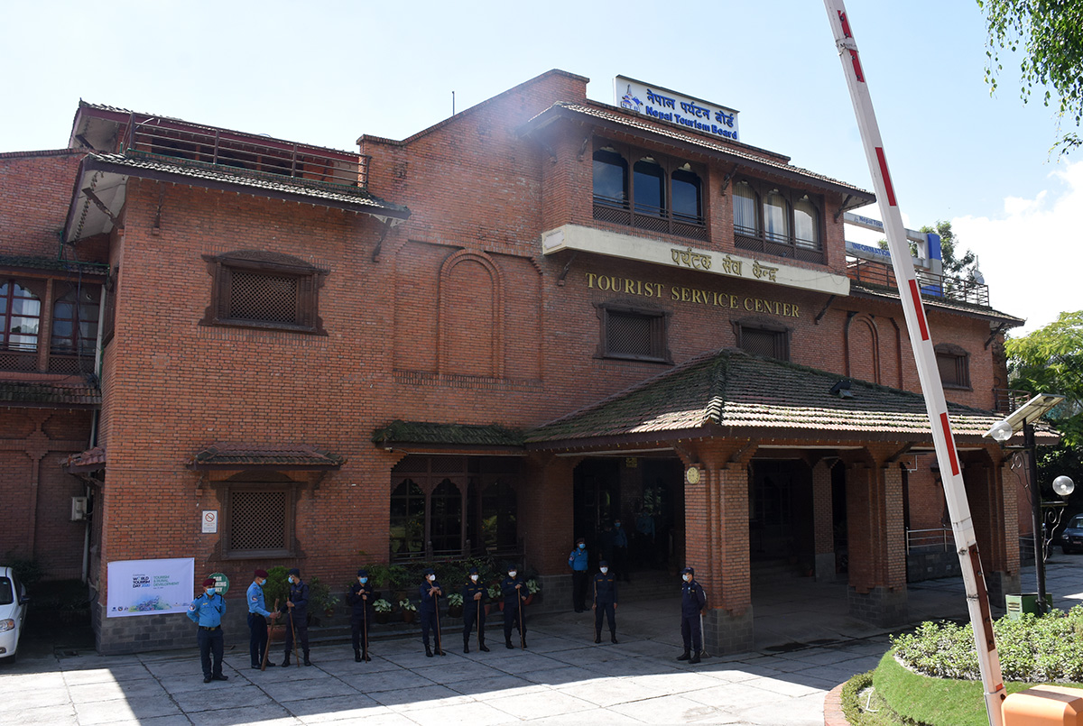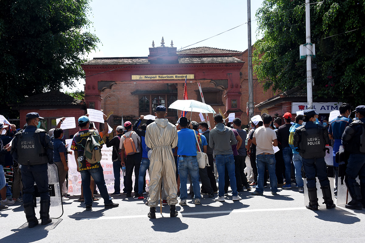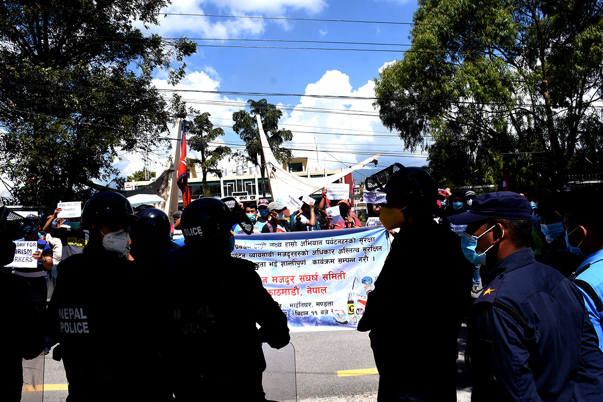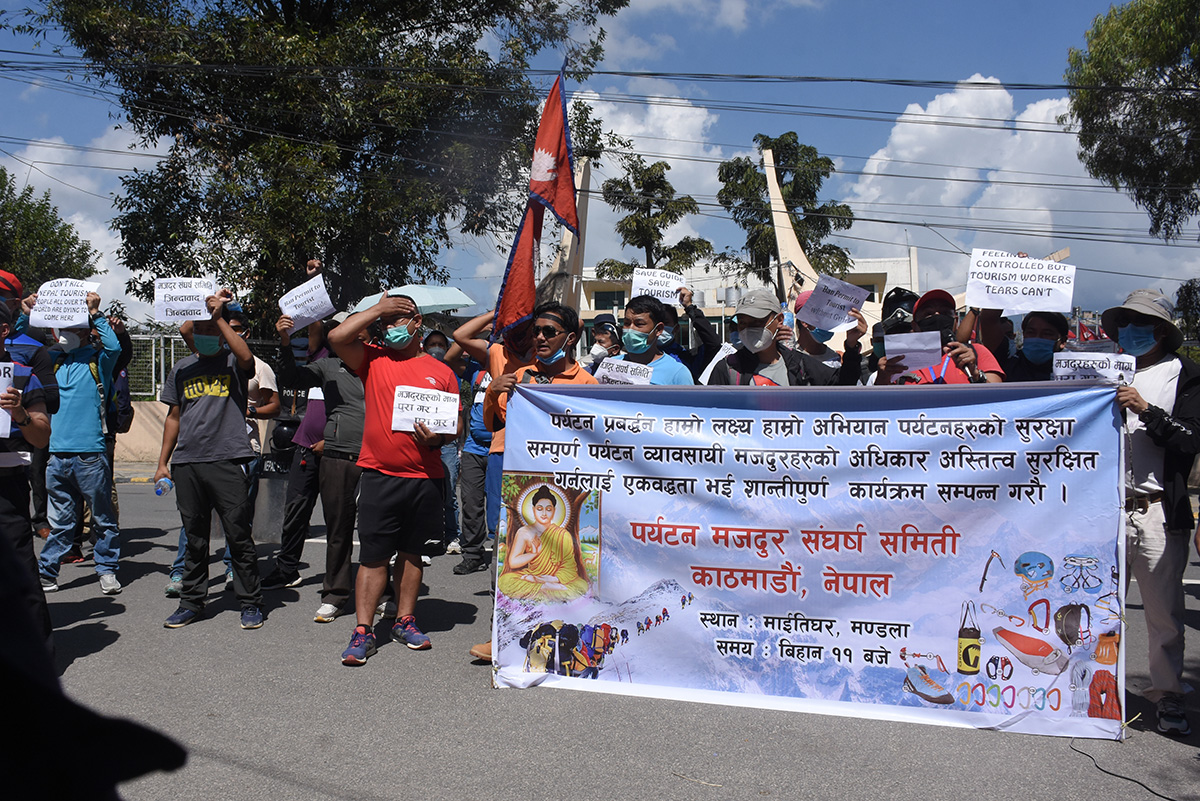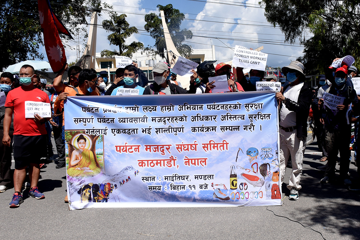 काठमाडौं, ११ असोज । आज विश्व पर्यटन दिवस हो । पर्यटन मजदूरहरुले आज नेपाल पर्यटन बोर्ड (एनटिबी) घेराउ गरेका छन् । कोरोना महामारीलाई मध्येनजर गरेर सरकारले लामो समय लकडाउन लगाउँदा पर्यटन मजदुरहरु बेरोजगार भएका छन् । पर्यटन मजदुर संघर्ष समिति, काठमाडौंको अगुवाईमा आज प्रदर्शन गरिएको हो । प्रदर्शनमा उत्रिएकाहरुले संस्कृति, पर्यटन तथा नागरिक उड्ययनमन्त्री योगेश कुमार भट्टराई र पर्यटन बोर्डका सिईओ डा. धनञ्जय रेग्मीको राजीनामा मागेका थिए ।
