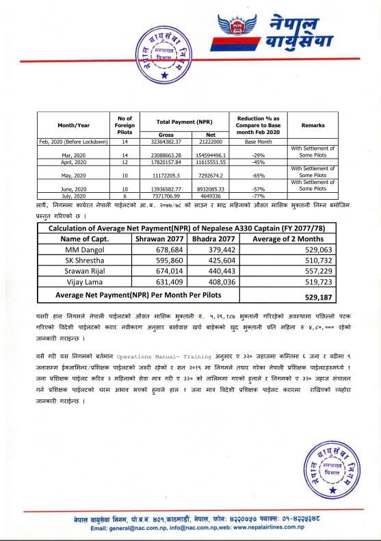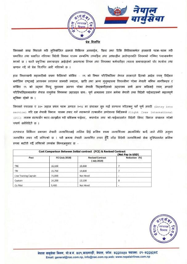 निगमले कोभिड–१९ महामारीको विषम परिस्थितिमा आवश्यक स्वास्थ्य सामग्री ल्याउन र विभिन्न देशमा अलपत्र परेका नागरिकलाई स्वदेश ल्याउन नेपाली तथा विदेशी पाइलटहरुको महत्वपूर्ण भूमिका निर्वाह गरेको जनाएको छ । जुलाई(साउन) महिनाको तथ्याङ्कअनुसार नेपाली पाइलटले न्यूनतम ५ लाख २९ हजार १८७ रुपैयाँ बुझेका छन् । त्यही समयमा विदेशी पाइलटले ४ लाख ८० हजार मात्र बुझेका छन् । निगमले जारी गरेको विज्ञप्तीमा २०७६ चैतदेखि विदेशीका हकमा ५० देखि ६० प्रतिशतसम्म सेवा सुविधा एवम् पारिश्रमिक कटौती गरिएको, करार अवधि समाप्त भएका सात जना विदेशी पाइलटको करार सेवा नवीकरण नगरिएको र हाललाई न्यूनतम सङ्ख्यामा उडानहरु भर्न सक्ने गरी ६ जनामात्र विदेशी पाइलट राखिएको बताइएको छ ।