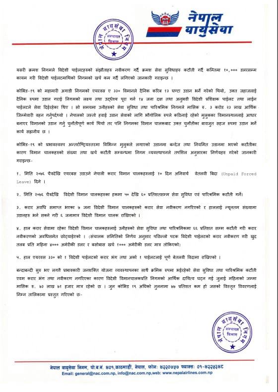 एयरवस ३३० को एक विदेशी पाइलटको करार भङ्ग तथा अर्का एक पाइलटलाई पूर्ण वेतलबी विदामा राखिएको निगमले जनाएको छ । बन्दाबन्दी शुरु भए लगत्तै प्रभावकारी जनशक्ति योजना व्यवस्थापनका साथै क्रमिकरुपमा भइरहेको सेवा सुविधा तथा पारिश्रमिक कटौती एवम् करार भङ्ग तथा नवीकरण नगरिएका कारण विदेशी पाइलटप्रति निगमको आर्थिक दायित्व घट्न गई जुलाई महिनामा जम्मा मासिक रु ७३ लाख ७१ हजार मात्र रहेको जनाएको छ । जुन कोभिड–१९ अघिको तुलनामा ७७ प्रतिशत कम हो ।