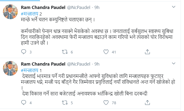 उनले अघि लेखेका छन्,‘देशलाई भारमात्र पर्ने गरी प्रधानमन्त्रीले आफ्नो सुविधाको लागि मन्त्रालयहरु फुटाएर मन्त्रालय थप्ने, मन्त्री पद बाँड्ने गैर जिम्मेवार प्रवृत्तिलाई नयाँ संविधानले अन्त गर्न खोजेको हो । देश विकास गर्ने सारा बजेटलाई अनावश्यक भर्तीकेन्द्र खोली बिना दरबन्दी मान्छे भर्ने चलन कम्युनिष्टले चलाएका छन् । कर्मचारीको पेन्सन धान्न नसक्ने भैसकेको अवस्था छ । जनतालाई सर्बसुलभ स्वास्थ्य सुबिधा दिन नसकिरहेको अवस्थामा फेरी मन्त्रालय बढाउने काम गरियो भने त्यसको घोर विरोधमा हामी उत्रने छौं ।”
