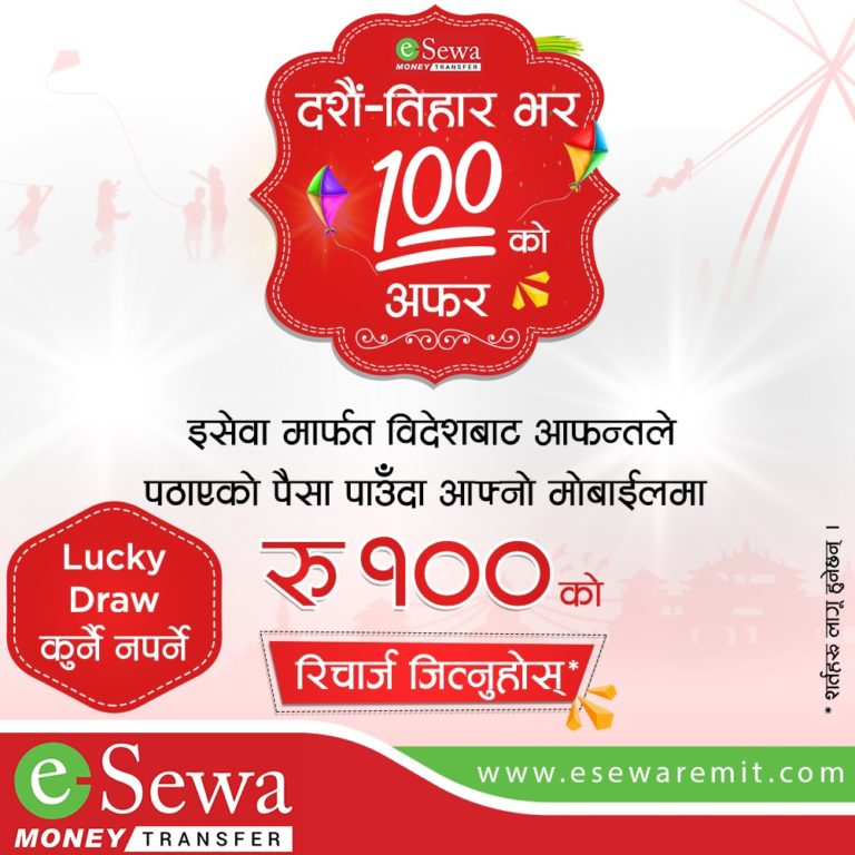 काठमाडौं, १९ असोज । इसेवा मनि ट्रान्स्फरले नेपालीहरूको महान पर्व दशैँ तिहार तथा छठलाई लक्षित गर्दै ‘दशैँ तिहार भर सयको अफर’ योजना सार्बजनिक गरेको छ । यस योजना अन्तरगत इसेवा मनि ट्रान्स्फर मार्फत विदेशबाट आफन्तले पठाएको रकम प्राप्त गर्दा रू सय बराबरको रिचार्ज जित्न सकिन्छ ।