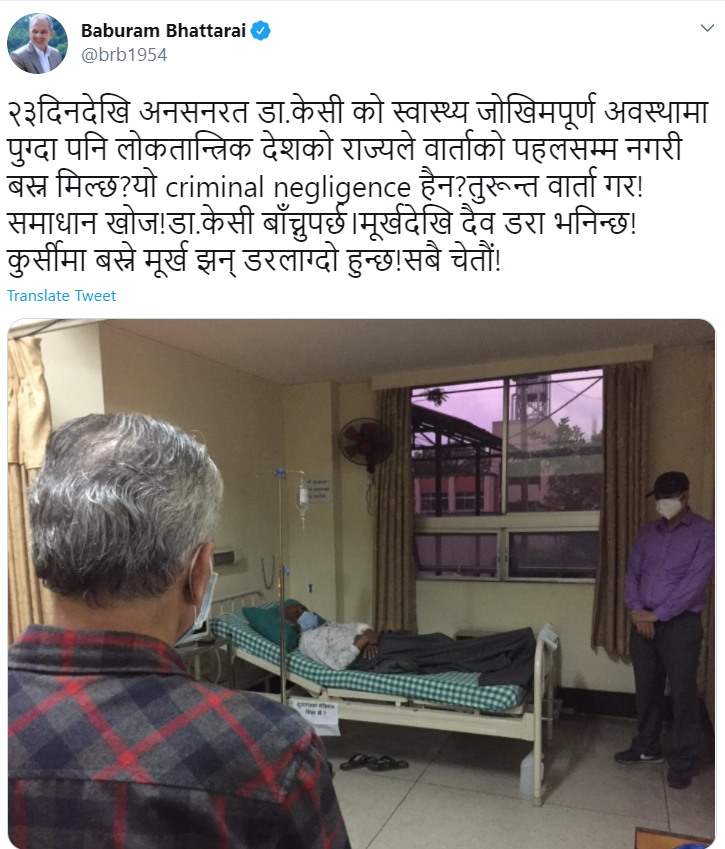 सामाजिक सञ्जाल ट्विटरमार्फत डाक्टर केसीलाई भेटेको तस्विर राख्दै डा. भट्टराईले यस्तो प्रश्न गरेका हुन् । उनले भनेका छन्,‘२३दिनदेखि अनसनरत डा. केसीको स्वास्थ्य जोखिमपूर्ण अवस्थामा पुग्दा पनि लोकतान्त्रिक देशको राज्यले वार्ताको पहलसम्म नगरी बस्न मिल्छरुयो अचष्mष्लब िलभनष्निभलअभ हैनरुतुरून्त वार्ता गर१समाधान खोज१डा।केसी बाँच्नुपर्छ।मूर्खदेखि दैव डरा भनिन्छ१कुर्सीमा बस्ने मूर्ख झन् डरलाग्दो हुन्छ१सबै चेतौं१