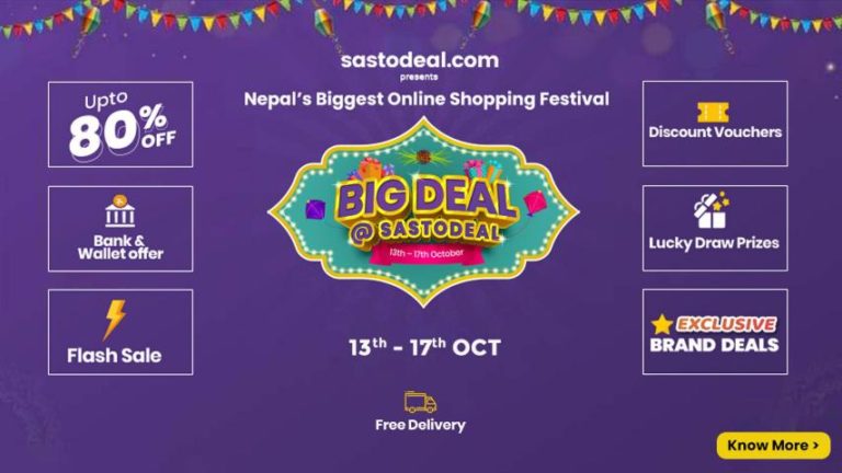 काठमाडौं, २९ असोज । नेपालको अग्रणी स्थानीय ई-कमर्स सस्तोडिल डटकमले दशैंको अवसर पारेर ’बिग डिल एट सस्तोडिल’ अफर ल्याएको छ । असोज २७ गतेदेखि कात्तिक १ गतेसम्म चल्ने अफरमा उपभोक्ताले ८० प्रतिशतसम्म छुट पाउने सस्तोडिलका संस्थापक अमुन थापाले बताए।  सस्तोडिलको अफर अनलाइन सपिङ माध्यमको सबैभन्दा ठूलो मेला भएको थापाले बताए। यसले देशभरका विक्रेताहरुको उत्पादनहरुलाई एउटै प्लेटफर्ममा सामेल गर्नेछ । विभिन्न आकर्षक अफरसँगै निशुल्क होम डेलिभरी गरिने थापाले जानकारी दिए ।