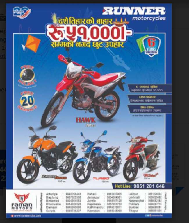 देशैभरी करिब २२ वटा शोरुम बाट ग्राहकले दशैं तिहार अंतर्गत रु ५१ हजार सम्म छुट का साथ सेल्स, सर्भिस र स्पेयर पार्टस को सुविधा पाउने छन । रमन मोटर्सले हाल ८० सि सि का सस्ता देखी २०० सि सि सम्मका प्रिमियम मोटरसाइकल तथा स्कुटर विक्री वितरण गर्दै आएको र उक्त ब्राण्ड को दिन दिनै बजार बढ्दै गएको कंपनीले जनाएको छ ।