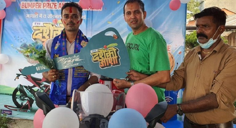 काठमाडौं, ३ कार्तिक । झापाका गणेशप्रसाद गौतमले टीभीएस अपाचे आर. आर. ३१० मोटरसाइकल जितेका छन् । ‘टीभीएस दसैंको आशा’ योजना अन्तर्गत कम्पनीले राखेको बिग अफरमा गौतमले विना लगानी आरआर ३१० जितेका हुन् । टीभीएसको कुनै पनि मोटरसाइकल तथा स्कुटर खरिद नगरी गौतमले फर्म भरेकै आधारमा लक्की ड्र मार्फत उक्त बाइक निःशुल्क प्राप्त गरेका हुन् ।