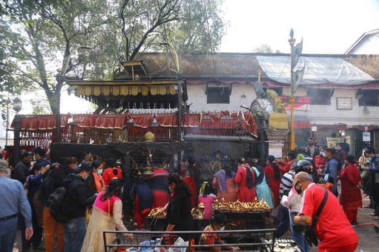 काठमाडौँ ८ कार्तिक: विजया दशमीको आठौँ दिन शनिबार महाअष्टमीका दिन काठमाडौँको भद्रकाली मन्दिरमा पूजाआजा गर्दै भक्तजन ।