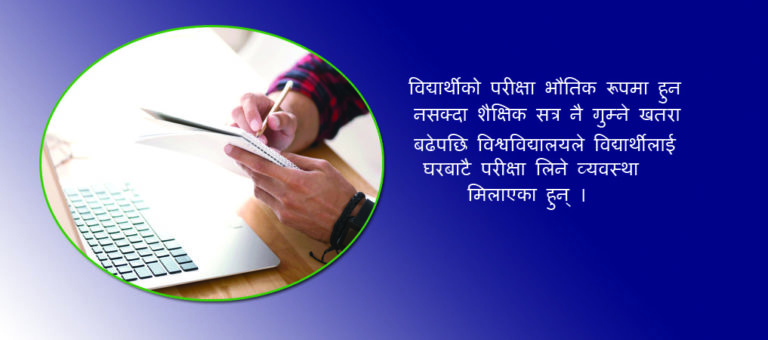 काठमाडौं, कात्तिक १४ । उच्च शिक्षा अध्ययन गर्ने विद्यार्थीले घरमै परीक्षा (होम इग्जाम)को अनुभव सँगालेका छन् । कोरोना भाइरस (कोभिड–१९)का कारण विद्यार्थीको परीक्षा भौतिक रूपमा हुन नसक्दा शैक्षिक सत्र नै गुम्ने खतरा बढेपछि विश्वविद्यालयले विद्यार्थीलाई घरबाटै परीक्षा लिने व्यवस्था मिलाएका हुन् । पूर्वाञ्चल तथा लुम्बिनी बौद्ध विश्वविद्यालयले विद्यार्थीलाई घरबाटै परीक्षा लिने व्यवस्था मिलाएका छन् ।
