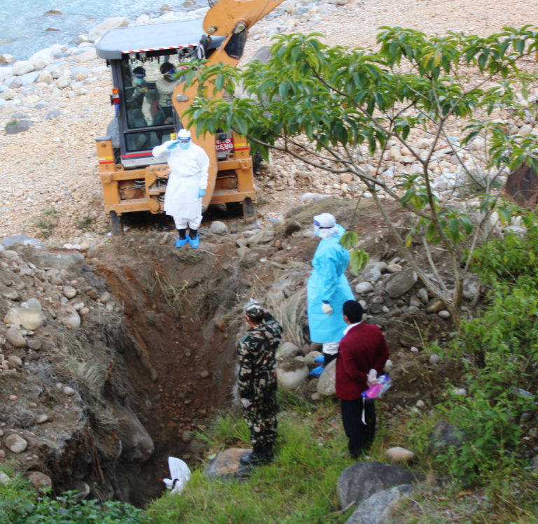गलकोट, १८ कात्तिकः कोरोनाबाट सङ्क्रमित भएका बागलुङ नगरपालिका–३ का ६६ वर्षीय पुरुषको धौलागिरि अस्पतालमा उपचारको क्रममा मङ्गलबार मृत्यु भएपछि उहाँको शव कालीगण्डकी किनार निरयघाटमा व्यवस्थापन गर्ने क्रममा नेपाली सैनिक । तस्बिर : खेमराज गौतम/ रासस