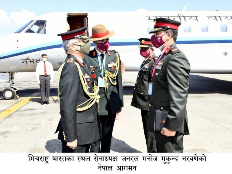 काठमाडौं, १९ कार्तिक । तीन दिने नेपाल भ्रमणको लागि आज काठमाडौं ओर्लिएका भारतीय सेनाअध्यक्ष मनोज मुकुन्द नरवणे र उनकी धर्मपत्नी विना नरवणेलाई त्रिभुवन विमानस्थलमा नेपाली सेनाका बलाधिकृत रथी प्रभुराम शर्मा र श्रीमती सुनिता शर्माले स्वागत गरेका छन् । तस्विर : नेपाली सेना