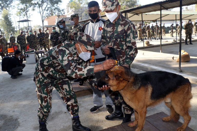 काठमाडौँ, २९ कात्तिक: कुकुर तिहारको दिन शनिबार मध्यपुर थिमि–२ सानोठिमीस्थित भैरव बहान गुल्ममा कुकुर पूजाको साथ् तालिम नमूना अभ्यास प्रस्तुत गरिँदै ।