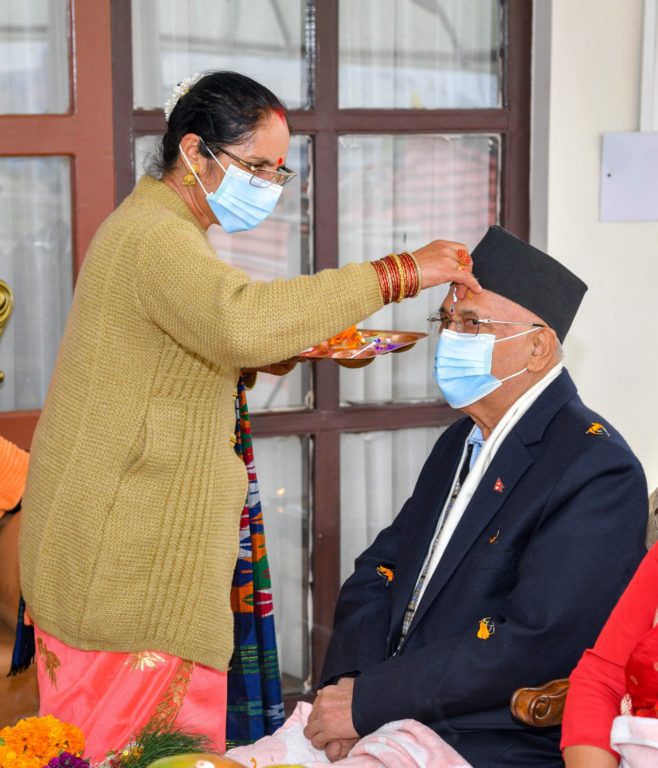 काठमाडौं, १ मंसिर । प्रधानमन्त्री केपी शर्मा ओलीले आफ्नी बहिनी कौशल्या कोइरालाको हातबाट भाइ टीका लगाएका छन् । उक्त अवसरमा प्रधानमन्त्री ओलीले पनि बहिनीलाई टीका लगाईदिएका थिए । प्रधानमन्त्री ओलीका प्रेस सल्लाहकार सूर्य थापाले सामाजिक सञ्जालमार्फत यस्तो जानकारी गराएका छन्,”सम्माननीय प्रधानमन्त्री केपी शर्मा ओलीले तिहारकाे भाइ टीका लगाउनु भएको छ । बहिनी काैशल्या काेइरालाले बालुवाटारमा आफ्ना दाजु र भाउजुलाई टीका लगाइदिनु भयाे । साेअवसरमा प्रधानमन्त्रीले पनि आफ्नी बहिनीलाई टीका लगाइदिनुभयाे ।”