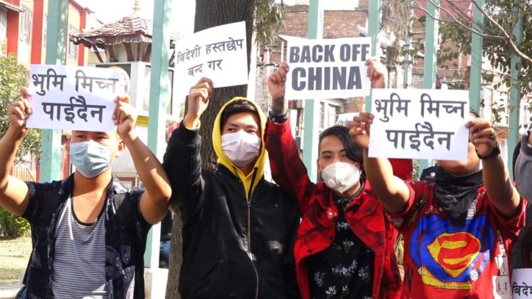 काठमाडौं, ६ मंसिर । काठमाडौंमा आज चिनियाँ हस्तक्षेपको विरुद्धमा प्रदर्शन भएको छ । प्रदर्शनमा उत्रिएकाहरुले ‘ब्याक अफ चाईना’ लेखेको प्लेकार्ड बोकेका थिए । चाईनिज विस्तारवाद मुर्दावाद, भूमि मिच्न पाईँदैन्, विदेशी हस्तक्षेप बन्द गर लगायतका नारा लगाएका थिए ।