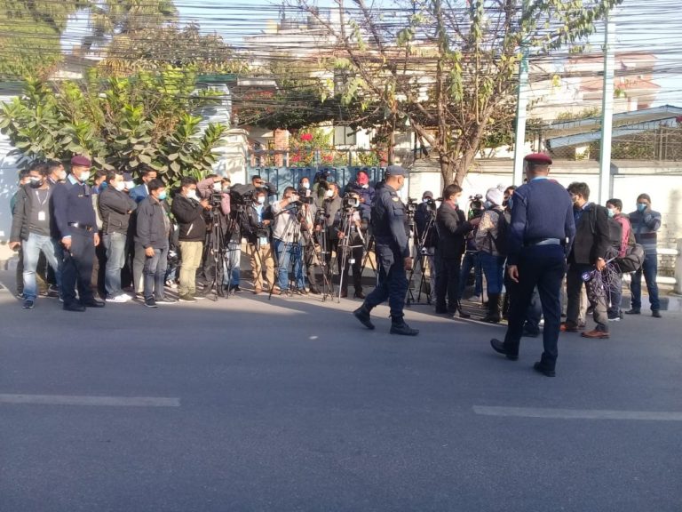सुरुमा नाम टिपाईएपनि पछि सञ्चारकर्मीहरुलाई बाहिरै बस्न भनिएको हो । सञ्चारकर्मीहरु अब बाहिरै बस्ने र प्रवक्ताले सडकमै आएर बैठकको बारेमा सुचना दिनुपर्ने अडान राखेका छन् । तस्विर : मुकुन्द कालिकोटे, रिपोर्टर्स नेपाल डटकम