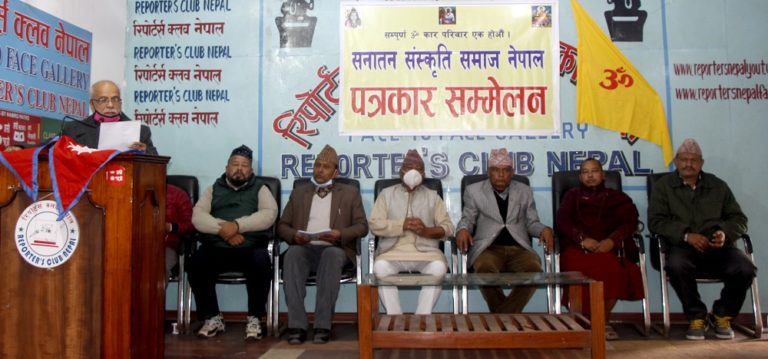 काठमाडौ, २३ मंसिर । सनातन संस्कृति समाज नेपालले देशलाई राजसंस्थासहितको हिन्दुराष्ट्र बनाउन अभियानलाई गति दिने बताउँदै सात बुँदे मागको घोषणा गरेको छ । आज रिपोर्टर्स क्लब नेपालमा पत्रकार सम्मेलन आयोजना गरी समाजले सरकारलाई मागबारे ध्यानाकर्षण गराउन २५ मंसिर बिहिबार माइतीघर मण्डलमा प्रदर्शन गर्ने जनाएको हो ।