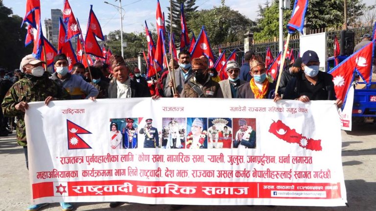 काठमाडौं, २६ मंसिर । राजसंस्था र हिन्दुराष्ट्रको पुर्नवहाली गर्दै देशभर प्रदर्शनको सिलसिला चलेको छ । मुख्य शहरहरुमा दिनहुँ प्रदर्शन हुनथालेको हो ।