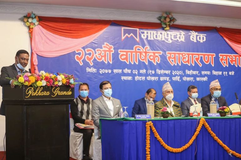 काठमाडौं, ४ पुष । माछापुच्छ्रे बैंक लिमिटेडको २२औँं वार्षिक साधारणसभा सम्पन्न भएको छ । साधारणसभाको उद्घाटन बैंकका अध्यक्ष डा. वीरेन्द्र प्रसाद महतोले गरेका हुन् । गत बिहीबार होटल पोखरा ग्राण्ड, पोखरामा सम्पन्न २२औं साधारणसभाले बैंकको आर्थिक वर्ष २०७६/७७ को वार्षिक प्रतिवेदन पारित गर्नुका साथै बैंकको सञ्चालक समितिले प्रस्ताव गरेअनुसार सेयरधनीहरुलाई हालको चुक्ता पूँजीको १०.४ प्रतिशत लाभांश जसमध्ये ३.३७ प्रतिशत नगद र ७.०३ प्रतिशत बोनस लाभांश प्रदान गर्ने प्रस्ताव पारित गरेको छ ।