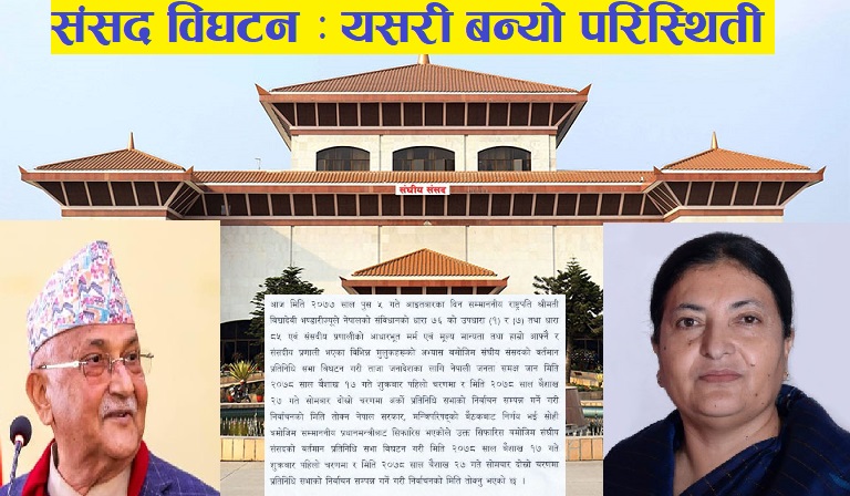 काठमाडौं, पुस ६ । प्रधानमन्त्री केपी शर्मा ओलीले संसद् अधिवेशन अन्त्य गरेको लगभग ६ महिनापछि चालेको संसद् विघटनको कदम ‘संविधानकै मर्ममा प्रहार’ भएको कानुनका जानकारले टिप्पणी गरेका छन्। यसअघिका संविधानमा प्रधानमन्त्रीले सिधै संसद् विघटन गर्न सक्ने व्यवस्था दुरूपयोगबाट पाठ सिक्दै संविधानमा यस्तो अधिकार दिइएको थिएन। तर गलत बाटोबाट ओलीले संसद् विघटन गरेकोमा व्यापक असन्तुष्टि देखिएको हो।