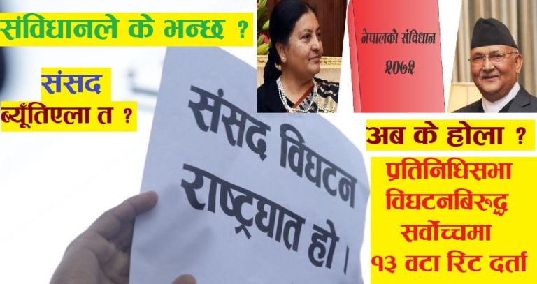 पुष ७, काठमाण्डौ । प्रधानमन्त्रीको शिफरिसमा राष्ट्रपति विद्यादेवी भण्डारीले प्रतिनिधिसभा विघटन गरेर बैशाख १७ र २७ गते दुई चरणमा आम निर्वाचनको घोषणा गरेसँगै नेपालको राजनीति तरंगित भएको छ । कानुनविद्हरु समेत कित्ताकाट भएर आ–आफ्नो ब्याख्यामा उत्रिदैगर्दा संसद बिघटन सहि वा गलत भनेर संविधानको अन्तिम ब्याख्या गर्ने दायीत्व पुन सर्वोच्च अदालतको काँधमा पुगेको छ । अहिले अदालतमा प्रतिनिधिसभा विघटनबिरुद्ध १३ वटा रिट दर्ता भएर फैशलाको प्रक्रियामा गएका छन् ।