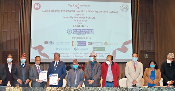 लगानी गर्ने सम्बन्धमा भएको सप्लिमेन्ट्री सिन्डिकेटेड क्रेडिट फ्यासिलिटिज एग्रिमेन्ट (एसएससीएफए) सम्झौतापत्र ऋणीका तर्फबाट नाशा हाइड्रो पावर प्रालिका अध्यक्ष मोतिलाल दुगड तथा बैङ्कहरूका तर्फबाट नेपाल बैङ्कका प्रमुख कार्यकारी अधिकृत कृष्णबहादुर अधिकारीले एकआपसमा आदानप्रदान गरेका छन् । सम्झौता आदानप्रदानमा सहभागी सबै बैङ्क तथा वित्तीय संस्थाका अध्यक्ष÷ प्रमुख कार्यकारी अधिकृत तथा अन्य पदाधिकारीको उपस्थिति थियो ।