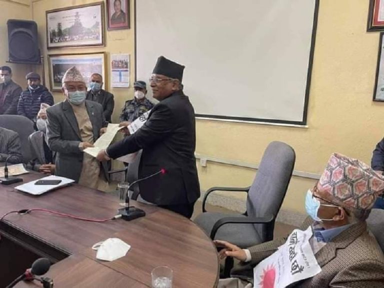 काठमाडौं, १० पौष । नेपाल कम्युनिस्ट पार्टीको प्रचण्ड पक्षका अध्यक्ष पुष्पकमल दाहाल आज आफ्नो पक्षका हस्ती नेताहरु बोकेर निर्वाचन आयोग पुगे । विहानै जुलुससहित निर्वाचन आयोग पुग्नुअघि माइतीघर मण्डलामा केही समय धर्नामा बसे । धर्नामा अर्का अध्यक्ष माधवकुमार नेपाल, वरिष्ठ नेता झलनाथ खनालका अलावा स्थायी कमिटीका सदस्यहरु समेत उपस्थित थिए ।