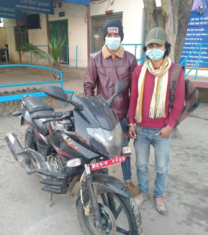जिल्ला रामेछाप मन्थली नगरपालिका–१२ घर भएका २५ वर्षीय रामशरण मिजार र १९ वर्षीय सुवास मिजारलाई चोरी गरेको बा ८१ प ५२७५ कालो रङको पल्सर २२० सिसी मोटरसाइकलसहित पक्राउ गरेको महानगरीय ट्राफिक प्रहरी महाशाखाका प्रमुख एसएसपी जनक भट्टराईले जानकारी दिए ।