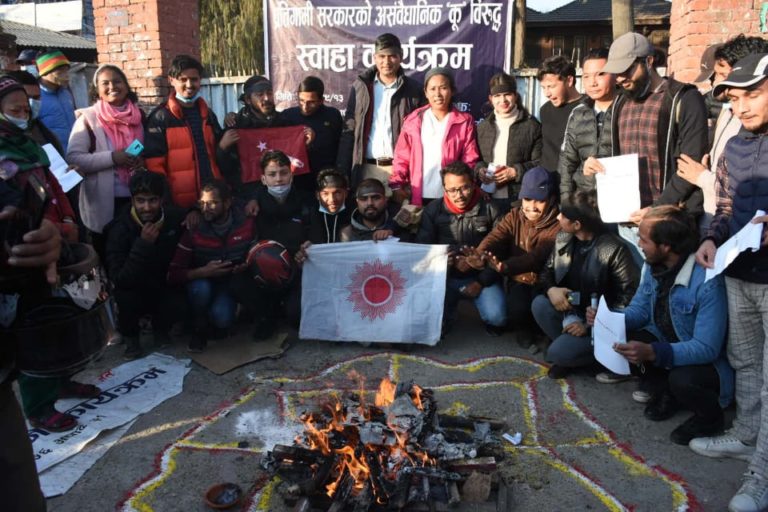 काठमाडौं, १३ पुस । अखिल नेपाल स्वतन्त्र विद्यार्थी युनियन (अनेरास्ववियू) वाल्मीकिले आज प्रतिगामी असंवैधानिक कू विरुद्ध स्वाहा कार्यक्रमको आयोजना गरेको छ । आज अपरान्ह काठमाडौंस्थित् वाल्मीकि क्याम्पसअघि स्वाहा कार्यक्रम आयोजना गरेको हो । उनीहरुले ‘केपी ओली स्वाहाः’, वाईडबडी स्वाहाः पानी जहान स्वाहाः, दुई तिहाउर्यको सरकार स्वाह: भनेर होम आदि गरेका थिए । पछिल्लो समय नेकपाभित्र केपी शर्मा ओली पक्ष र पुष्पकमल दाहाल–माधव कुमार नेपाल पक्ष गरि दुई समूह विभाजित छ । प्रधानमन्त्री ओलीले संसद विघटन गरेपछि उनको विरोधमा दाहाल–नेपाल समूहले देशव्यापी रुपमा प्रदर्शन गरिराखेको छ । तस्विर : मुकुन्द कालिकोटे, रिपोर्टर्स नेपाल डटकम
