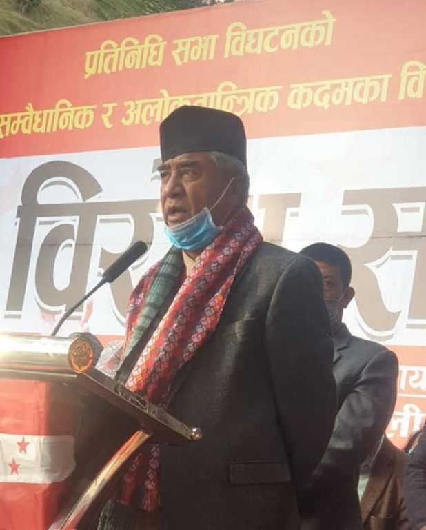 नेपाली काँग्रेसले आज देशभरका १६५ निर्वाचन क्षेत्रमा सरकारविरुद्ध गरेको प्रदर्शनका क्रममा भक्तपुर क्षेत्र नम्बर २ मा बोल्दै देउवाले भने,‘काँग्रेस कानुन मान्ने पार्टी हो, अदालतमा विचाराधीन मुद्दामा यो या त्यो गर भन्दैन ।’ देउवाले प्रधानमन्त्री ओलीको संसद बिघटन गराउने कदमलाई असंवैधानिक भने । उनले काँग्रेसले अदालतको आदेशको समेत पालना गर्ने बताए ।