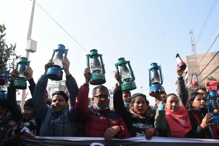 काठमाडौं, २२ पौष । प्रधानमन्त्री केपी शर्मा ओलीको प्रतिनिधिसभा बिघटनविरुद्ध नेपाल कम्युनिस्ट पार्टीको प्रचण्ड-माधव समूहनिकट अनेरास्ववियूले लालटिन जुलुस निकालेको छ । आज राजधानीमा अनेरास्ववियूका विद्यार्थीले लालटिन जुलुस निकालेका हुन् ।