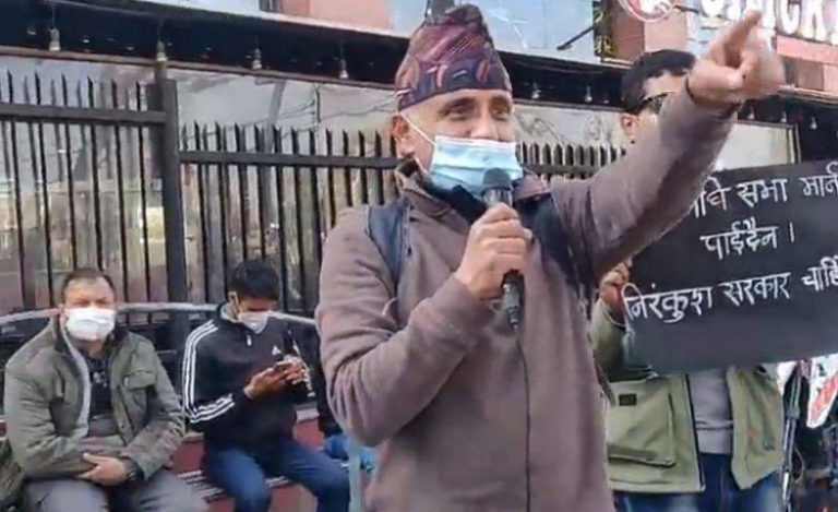 काठमाडौं, २५ पुस । प्रतिनिधि सभा विघटनविरुद्ध डा. गोविन्द केसी पनि सडकमा ओर्लिएका छन् । शनिबार काठमाडौंको माइतीघर मण्डला पुगेर उनले बिघटनको विरोध गरेका छन् । केसीसहितका प्रदर्शनकारीले प्रतिनिधि सभा विघटन गरिएकोमा असन्तुष्टि जनाउँदै विरोध जनाएका छन् ।