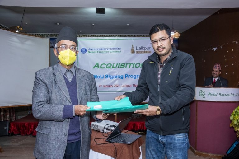 काठमाडौं, २६ पुस । नेपाल फाइनान्सले ललितपुर फाइनान्सलाई प्राप्ति गर्ने सैद्धान्तिक सहमतिपत्रमा हस्ताक्षर भएको छ । नेपाल फाइनान्सको तर्फबाट संचालक समितिका अध्यक्ष प्रा.डा.हिरेन्द्रमान प्रधान र ललितपुर फाइनान्सको तर्फबाट संचालक समितिका अध्यक्ष दिपक महर्जनले हस्ताक्षर गरेका हुन् ।