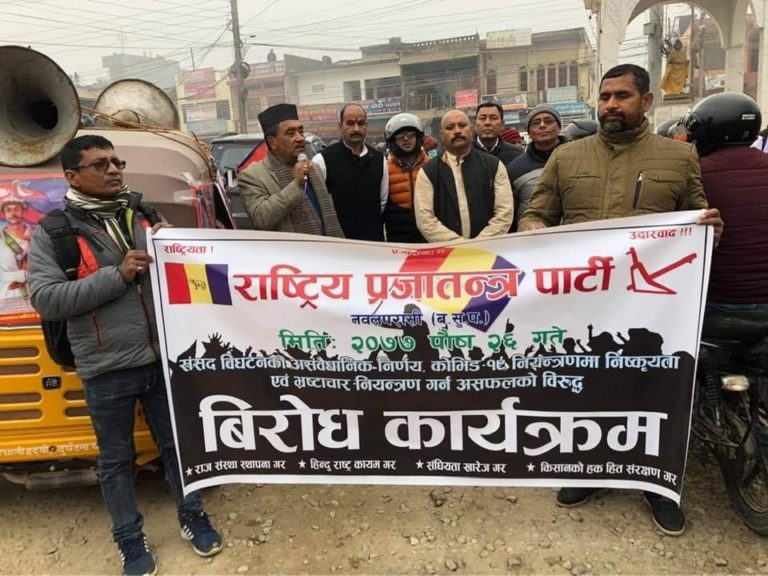 ‘प्रजातन्त्र भनेकै जनताको शासन हो । प्रजातान्त्रिक शासन पद्धतिमा जनमतको कदर हुनु अपरिहार्य छ । यसैले हिन्दुराष्ट्रको माग गर्दै देशव्यापी उर्लेको जनलहरको कदर गरेर देशमा हिन्दुराष्ट्र् पुनःस्थापना गर्न जरुरी भएको छ,’ राप्रपाका सचिवालय प्रमुख प्रधानले महेशपुरमा आयोजित विरोध र्यालीलाई सम्बोधन गर्दै भने ।