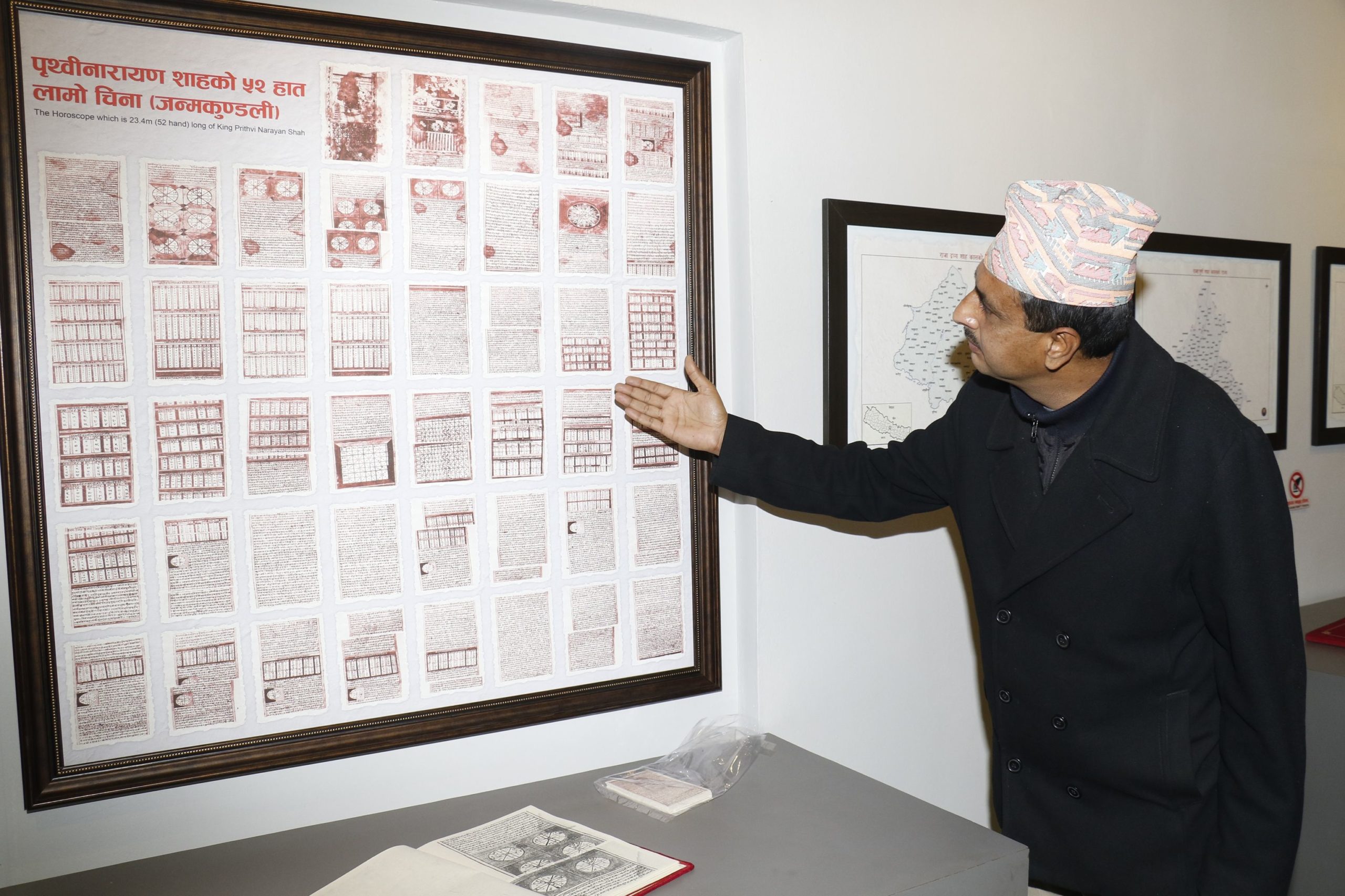 केन्द्रमा प्रवेश गर्नासाथ पूर्णकदको पृथ्वीनारायण शाहको चित्राकृति देखिन्छ । उक्त आकृतिसँगै एकीकरणको अभियानसँग जोडिएको किंवदन्तीअनुरुप त्यसबेलामा सम्पर्क रहेका गोरखनाथको आकृति र शाहवंशीय वंशवृक्ष राखिएको छ । केन्द्रमा कपडामा लेखिएको ५२ हातको हस्तलिखित जन्मकुण्डली(राष्ट्रनिर्माता)को छविचित्र प्रस्तुत गरिएको छ । पृथ्वीनारायणको राजगद्दीसँग मिल्ने गरी तत्कालीन सिंहासन राखिएको छ । युद्धमा जानुपूर्व त्यस बेलाका पण्डितद्वारा दिन र समय तोकेर निकालिएका शुभसाइतसम्बन्धी जानकारी पुस्तक पनि अनुसन्धानकर्ताका लागि महत्वपूर्ण दस्तावेज हुनेछ । एकीकरणका नायक पृथ्वीनारायणले छिमेकी र छिमेकी राजाले उहाँलाई लेखेका करीब २०० चिट्ठीको संँगालो पनि इतिहास जान्न चाहनेका लागि निकै महत्वपूर्ण खुराक हुने छ ।