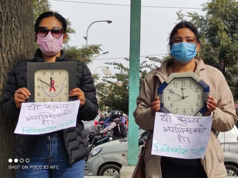 काठमाडौं, ४ माघ । प्रतिनिधि सभा विघटनविरुद्ध विवेकशील साझा पार्टीले घडी देखाएर प्रदर्शन गरेको छ । आज माइतीघर मण्डलामा विवेकशीले विरोध प्रदर्शन गरेको हो ।