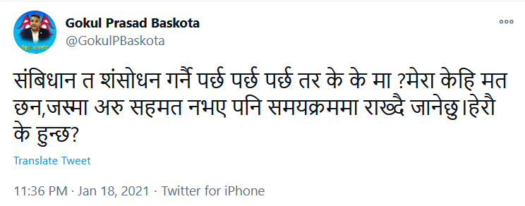 काठमाडौं, ६ माघ । नेपाल कम्युनिष्ट पार्टी (नेकपा) ओली समूहका प्रभावशाली नेता तथा पूर्वमन्त्री गोकुल प्रसाद बाँस्कोटाले संविधान संशोधन गर्नुपर्ने माग उठाएका छन् । सामाजिक सञ्जाल ट्विटरमार्फत नेता बाँस्कोटाले यस्तो माग गरेका हुन् । उनले लेखेका छन्,‘संबिधान त शंसाेधन गर्नै पर्छ पर्छ पर्छ तर के के मा ?मेरा केहि मत छन,जस्मा अरु सहमत नभए पनि समयक्रममा राख्दै जानेछु।हेराै के हुन्छ?’