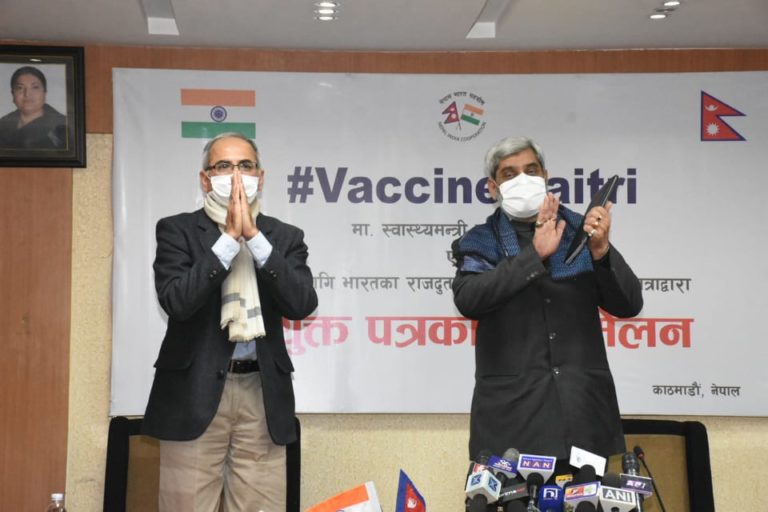 पत्रकार सम्मेलनमा स्वास्थ्य तथा जनसंख्यामन्त्री हृयदेश त्रिपाठी र नेपालका लागि भारतीय राजदूत विनयमोहन क्वात्राले सम्बोधन गरेका थिए । खोप भारतले नेपाललाई अनुदानमा दिने भएको हो । मन्त्री त्रिपाठीकाअनुसार भारतले दिने भ्याक्सिन भोलि नै नेपाल आईपुग्ने छ । र, खोप अग्रभागमा खटिनेहरुलाई प्राथमिकता दिईने पनि उनले जनाए ।