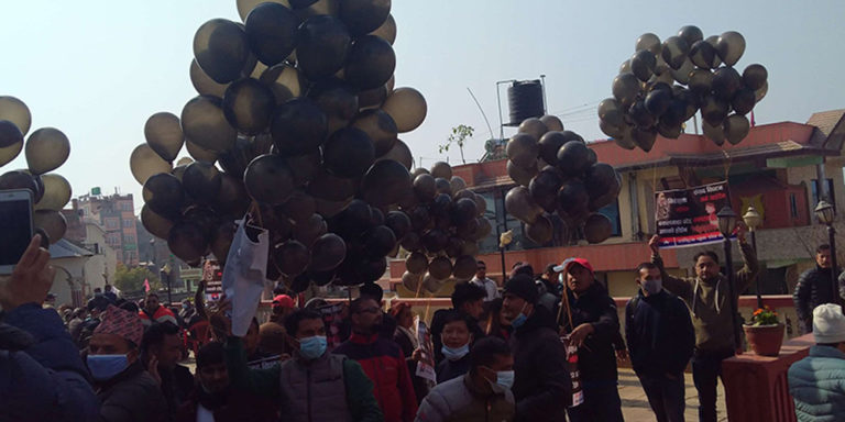काठमाडौं, ८ माघ । नेकपा प्रचण्ड–माधव समूह निकट राष्ट्रिय युवा संघले बेलून उडाएर प्रतिनिधिसभा विघटनको विरोध गरेका छन् । नेकपाको केन्द्रीय मुख्यालय पेरिसडाडाँबाट युवा संघले बेलुन उडाएर विरोध जनाएको हो ।