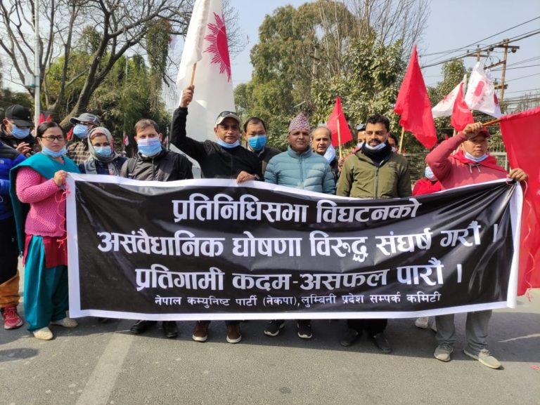 काठमाडौँ, ९ माघ: प्रतिनिधिसभा विघटनको विरोधमा नेपाल कम्युनिष्ट पार्टी (नेकपा) प्रचण्ड–नेपाल समूहले राजधानीका विभिन्न स्थानबाट विरोध जुलुस निकालेको छ । काठमाडौँ, भक्तपुर र ललितपुरका विभिन्न नौ स्थानमा भेला भएर नेकपाका नेता, कार्यकर्ता तथा स्थानीय जनसमुदायले जुलुस निकालेका छन् ।