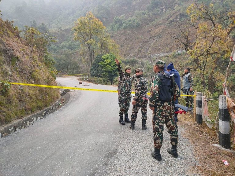 बैतडी, १० माघः महाकाली राजमार्गअन्र्तगत बैतडीको दोगडाकेदार गाउँपालिका–६ चम्तडीमा बीच सडकमा फेला परेको शंकास्पद वस्तु निस्क्रिय पार्न खटिएको नेपाली सेनाको टोली । रातो कपडामा तारसहित बम जस्तो देखिने डल्लो बनाएको अवस्थामा उक्त वस्तु फेला परेको हो ।-तस्वीरः विनोद सिंह विष्ट, रासस