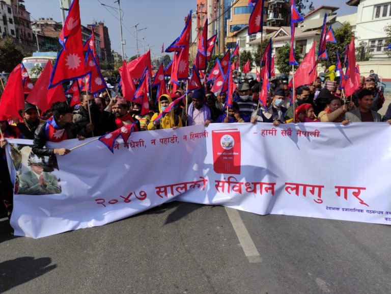 काठमाडौं, ११ माघ । २०४७ सालको संविधान लागु गर भन्दै देशभक्त प्रजातान्त्रिक गठबन्धनले आज काठमाडौंमा बृहत्त प्रदर्शन गरेको छ । उनीहरुले ‘न मधेशी, न पहाडी, न हिमाली–हामी सबै नेपाली’ लेखेको ठूलो ब्यानरमा २०४७ सालको संविधान लागु गर भनेर लेखिएको छ ।