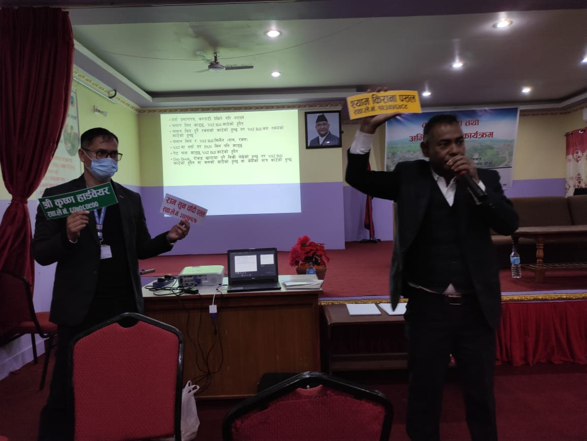 कार्यक्रममा पनौती नगरपालिका उपप्रमुख, बरिष्ठ शासकिय अधिकृत, उधोग बाणिज्य संघ पनौतीका अध्यक्ष भोला थापा तथा आन्तरिक राजस्व कार्यालय धुलिखेलका कर अधिकृत चन्दा खकुरेल, प्रभा ढुङ्गाना, सुवास खत्री समेतको सक्रिय सहभागिता रहेको थियो । करका विषयमा रहेका द्धिविधाहरूलाई चिर्दै करदातालाई छिटो छरितो तरिकाले सेवा प्रवाह गर्ने प्रणालीलाई अझै सुदृढ समेत गर्दै लैजाने र आवश्यक परे कर सम्वन्धी तालिमहरू समेत प्रदान गर्ने थप भनाईका साथ कार्यक्रम समापन गरिएको राजलवटले जनाए ।