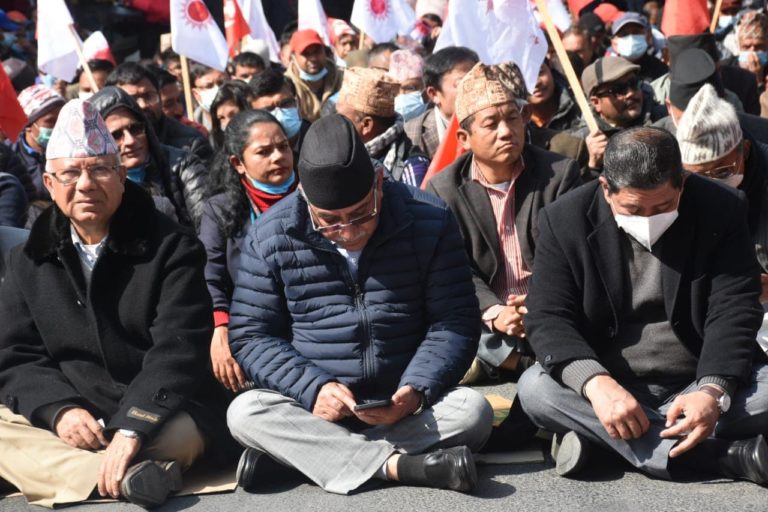 काठमाडौं, १८ माघ । नेपाल कम्युनिष्ट पार्टी (नेकपा) दाहाल–नेपाल समूहले प्रतिनिधिसभा विघटनविरुद्ध आज माईतीघरमा धर्ना दिएको छ । धर्नामा अध्यक्षद्धय पुष्पकमल दाहाल र माधव कुमार नेपाल पनि सहभागी छन् । धर्नामा बसेको बेलामा दाहाल भने मोबाईलमा व्यस्त देखिएका छन् । तस्विर : मुकुन्द कालिकोटे, रिपोर्टर्स नेपाल डटकम