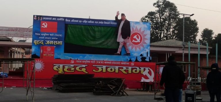 काठमाडौँ, २३ माघ: नेपाल कम्युनिष्ट पार्टी (नेकपा)ले आज बृहत्सभा शुरु हुनुभन्दा अगाडि विभिन्न स्थानबाट जुलुस निकालेको छ । पार्टी वाग्मती प्रदेश कमिटीले आयोजना गरेको सभा शुरु हुनुभन्दा अगाडि गौशाला, ज्ञानेश्वर, सोह्रखुट्टे, लैनचौर, प्रदशनीमार्ग, नयाँसडक बागबजार, त्रिपुरेश्वर, पुतलीसडक, भद्रकाली, रत्नपार्क, नयाँ बानेश्वर र माइतीघरबाट जुलुस निकालिएको छ । जुलुस सभास्थल नारायणहिटी दरबार अगाडि गएर सभामा परिणत हुनेछन् ।