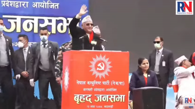 काठमाडौं, २३ माघ । नेपाल कम्युनिष्ट पार्टी (नेकपा) ओली पक्षका अध्यक्ष तथा प्रधानमन्त्री केपी शर्मा ओलीको सम्बोधन सुरु भएको छ । उक्त समूहले आज काठमाडौंमा बृहत्त जनसभाको आयोजना गरेको छ । हेरौं लाईभ भिडिओ :