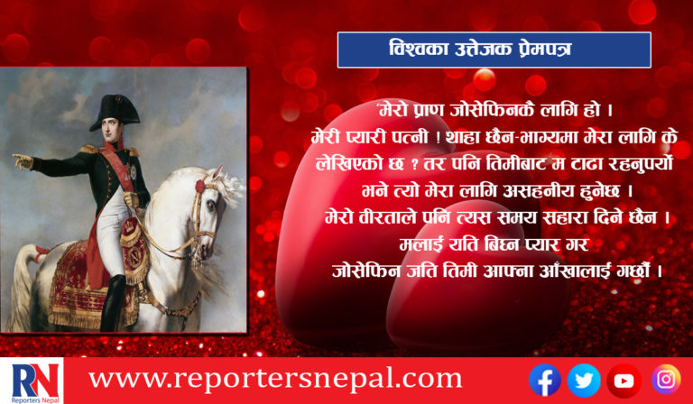 युवा जनरल नेपोलियन बोनापार्टलाई विवाहको दुई दिनलगत्तै इटालियन सेनाविरुद्ध लड्न मोर्चामा जानुपर्यो । उनले लडाइँको मोर्चाबाटै आफ्नी पत्नी जोसेफिनलाई प्रेमपत्र लेखे– ‘जोसेफिन, तिमी मेरा लागि अतुलनीय छौ । तिमीबाट टाढा रहँदा जीवनको कुनै पनि आनन्दले मलाई छुँदैन । तिमीबाट अलग रहँदा सारा संसार मेरा लागि विशाल मरुभूमि बन्छ र त्यसको निर्जनतामा म एक्लै भौंतारिने गर्छु–आफ्नो अतृप्त आकांक्षाका साथ ।’