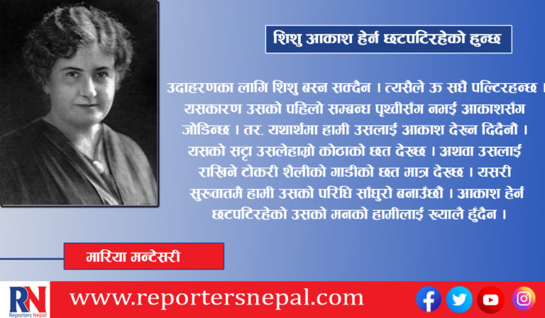 मारिया मन्टेसरी : आजसम्म अधिकांश वयस्कले शिशुको शरीरलाई एउटा सानो वनस्पतिजस्तै ठाने, जसको शारीरिक हेरचाह मात्र गरे पुग्छ । हामीले शिशुको शरीरको हेरचाह पनि अपुरो गर्यौं । वयस्कले शिशुको शारीरिक विकाससँगै मानसिक विकासमा पनि ध्यान दिनुपर्छ । शिशुलाई आफ्नो स्वरुप धारण गराउन प्रकृतिले नै सहयोग गरे पनि प्राकृतिक स्वरुप धारण गराउने प्रक्रियाको वयस्कले सम्मान गर्नुपर्छ । शिशुले आफ्नो प्राकृतिक स्वरुप सहजै धारण गर्न सक्ने वातावरण तयार पार्ने काम वयस्कको हो । आमाले आफ्नो पेटमा भ्रूणका लागि वातावरण तयार पारेजस्तै शिशुको मानसिक जीवनका लागि वयस्कले वातावरण तयार पार्नुपर्छ ।