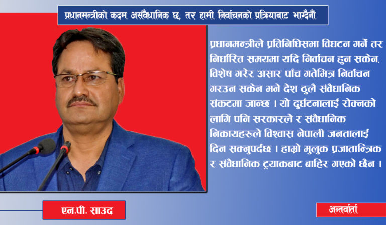 निर्वाचनको बारेमा त नेपाली काँग्रेसले प्रष्ट निर्णय गरेको छ । प्रधानमन्त्रीको जुन असंवैधानिक निर्णय छ । त्यो प्रजातान्तिक होइन् । त्यो संवैधानिक हाईन । यसको संवैधानिकताको बारेमा एउटै पार्टीले निर्णय गरेर निक्र्यौल निस्कने कुरापनि होईन । यसको अन्तिम निर्णय अदालतले दिन्छ र अदालतको निर्णय प्रतिनिधिसभा पूनःस्थापन भएपनि र विघटन भएपनि यसलाई नेपाली काँग्रेसले कार्यान्वयन गर्छ भन्ने कसरा नेपाली काँग्रेसले प्रतिवद्धता गरिसकेको छ । प्रतिनिधिसभा विघटन गरिसकेपछि पनि निर्वाचनलाई सुनिश्चित गर्ने काममा पनि हामी केन्द्रीत हुनुपर्छ । विशेष गरेर सरकारले, प्रधानमन्त्रीले प्रतिनिधिसभा विघटन गर्ने तर निर्धारित समयमा यदि निर्वाचन हुन सकेन, विशेष गरेर असार पाँच गतेभित्र निर्वाचन गराउन सकेन भने देश ठुलै संवैधानिक संकटमा जान्छ । यो दुर्घटनालाई रोक्नको लागि पनि सरकारले र संवैधानिक निकायहरुले विश्वास नेपाली जनतालाई दिन सक्नुपर्दछ । हाम्रो मुलुक प्रजातान्त्रिक र संवैधानिक ट्रयाकबाट बाहिर गएको छैन ।