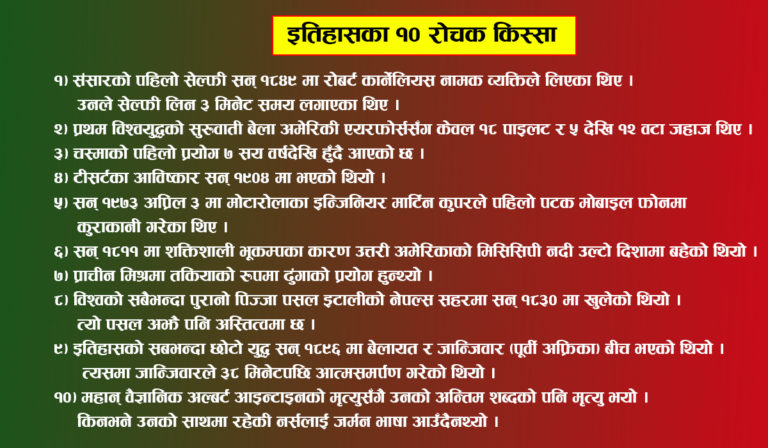 १०) महान् वैज्ञानिक अल्बर्ट आइन्टाइनको मृत्युसँगै उनको अन्तिम शब्दको पनि मृत्यु भयो । किनभने उनको साथमा रहेकी नर्सलाई जर्मन भाषा आउँदैनथ्यो ।